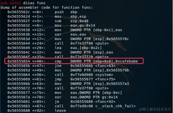 我们反汇编func看看比较key和0xcafebabe指令在哪儿