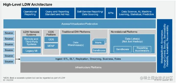 **第二个融合方向是数据湖和数据仓库协同起来向湖仓一体的融合分析架构发展,**随着企业数据量快速增长,不仅是结构化数据,也有非结构化数据,同时提出了对搜索/机器学习更多的能力要求,使得原来数仓技术不能够有效的处理复杂场景,为此需扩展原有系统,引入Hadoop大数据平台实现新类型数据、新业务场景的支持。在这个背景下由Gartner在2011年提出逻辑数据仓库的概念,预测企业数据分析倾向于转向一种更加逻辑化的架构,利用分布式处理、数据虚拟化以及元数据管理等技术,实现逻辑统一物理分开的协同体系。