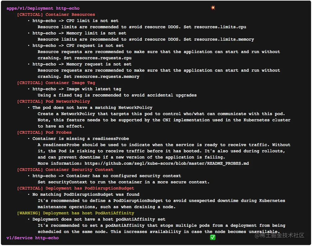 从如上可以看到针对这个文件给出的建议,比如资源限制、镜像TAG、Pod网络策略等。不错吧,非常好用的工具。。。