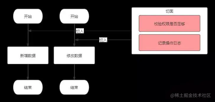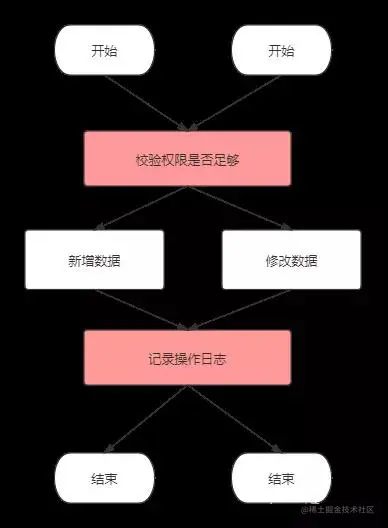 这样,代码冗余和可维护性的问题得到了解决,但每个业务方法中依然要依次手动调用这些公共方法,也是略显繁琐。有没有更好的方式呢?有的,那就是AOP,AOP将权限校验、日志记录等非业务代码完全提取出来,与业务代码分离,并寻找节点切入业务代码中: