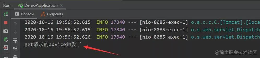 接下来,我们先看一个极简的例子:所有的get请求被调用前在控制台输出一句"get请求的advice触发了"。