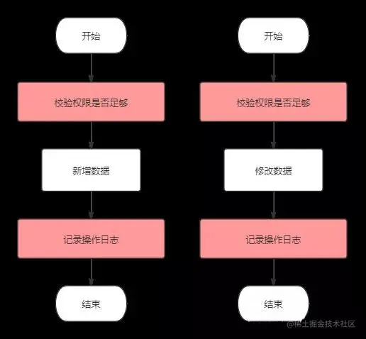 有多少业务操作,就要写多少重复的校验和日志记录代码,这显然是无法接受的。当然,用面向对象的思想,我们可以把这些重复的代码抽离出来,写成公共方法,就是下面这样: