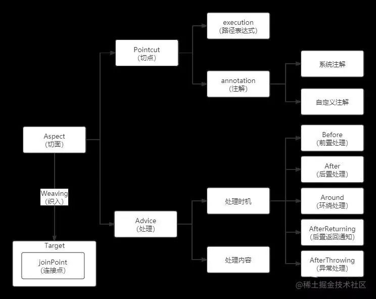Pointcut:切点,决定处理如权限校验、日志记录等在何处切入业务代码中(即织入切面)。切点分为execution方式和annotation方式。前者可以用路径表达式指定哪些类织入切面,后者可以指定被哪些注解修饰的代码织入切面。Advice:处理,包括处理时机和处理内容。处理内容就是要做什么事,比如校验权限和记录日志。处理时机就是在什么时机执行处理内容,分为前置处理(即业务代码执行前)、后置处理(业务代码执行后)等。Aspect:切面,即Pointcut和Advice。Joint point:连接点,是程序执行的一个点。例如,一个方法的执行或者一个异常的处理。在 Spring AOP 中,一个连接点总是代表一个方法执行。Weaving:织入,就是通过动态代理,在目标对象方法中执行处理内容的过程。