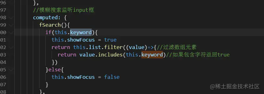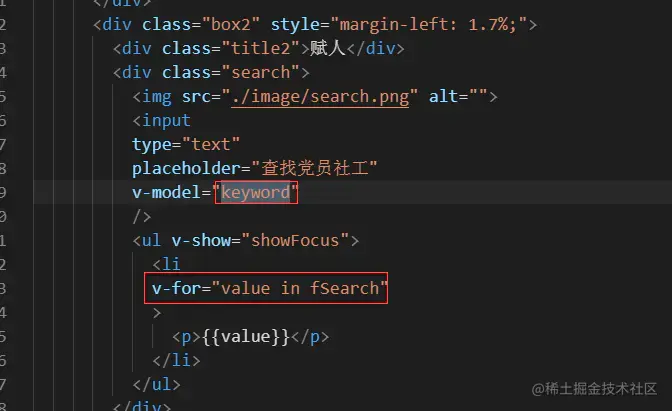 1.v-model双向绑定keyword,监听用户输入字符