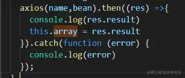 ** 获取axios请求到的数据时,能get到数据,但不能传值报错:TypeError: Cannot set property 'array' of undefined at eval (list.vue?51fc:19) 原因是使用在.then()里使用function会改变this指向,把.then里的function改为es6箭头函数写法就可以解决问题