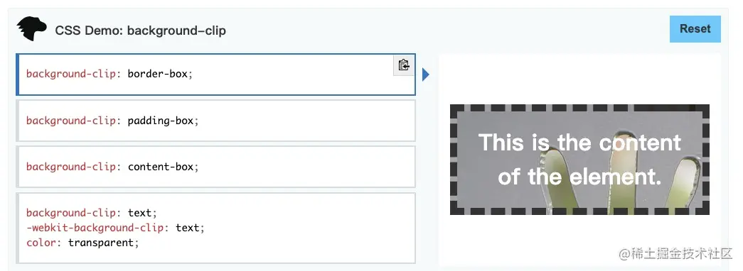 background-clip设置元素的背景(背景图片或颜色)是否延伸到边框,内边距盒子,内容盒子下面。