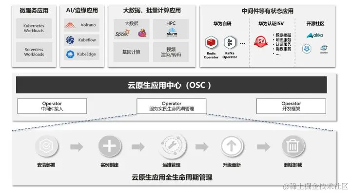 再升级应用架构:华为云针对客户应用架构升级的诉求,从开发工具、流程、迁移、生态等方面入手,建立了一套完整的解决方案,加速企业应用架构的云原生升级。某在线教育机构的容器架构师总结到:“我们通过对无状态应用进行云原生改造,使得整个流程80%以上的场景都实现自动化;AI平台云原生化,使得离线计算任务的成本下降43%,而且实现全自动化,非常感谢华为云给我们提供支持。”华为云打造的云原生应用中心OSC,已支持130+云原生应用,不仅包含微服务架构的无状态应用、分布式中间件、数据库等传统应用,还增加了AI、大数据以及边缘、5G、区块链等新型应用,帮助企业自选式构筑“All in Container”的云原生业务架构,提升业务的敏捷创新能力。除此之外,华为云还提供了云原生数据库服务GaussDB、云原生分布式中间件服务,以满足不同企业的业务诉求。