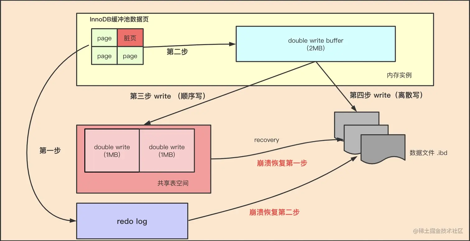 因为数据库使用的页(page,默认16KB)大小和操作系统对磁盘的操作页(page,默认4KB)不一样,当提交了一个页需要刷新到磁盘,会有多次IO, 此时刷了前面的8k时异常发生宕机。在系统恢复正常后,如果没有double write机制,此时数据库磁盘内的数据页已损坏,无法使用redo log进行恢复。