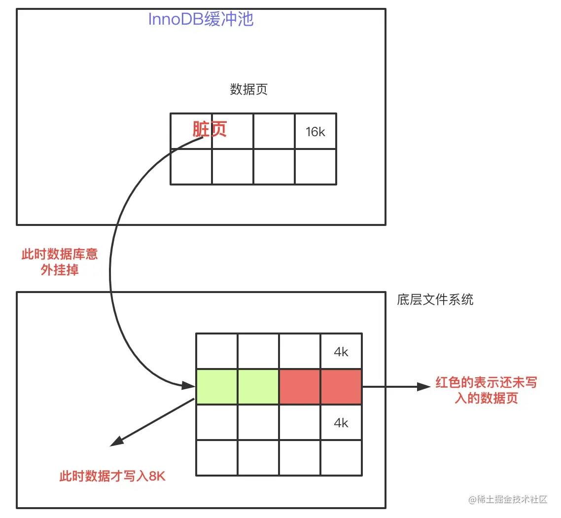 因为存储引擎缓冲池内的数据页大小默认为16KB,而文件系统一页大小为4KB,所以在进行刷盘操作时,就有可能发生如下场景: