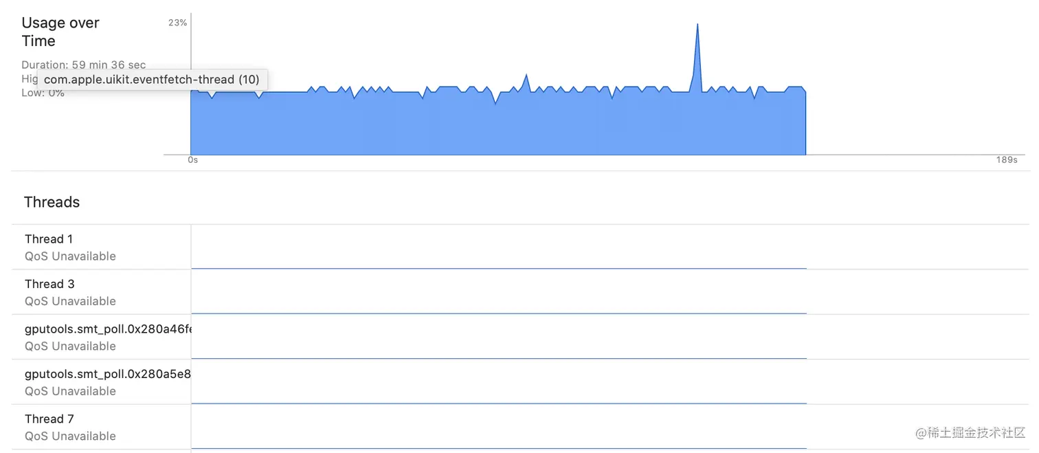 获取应用的CPU占用,app作为一个进程在系统中运行,运行进程又包含多个线程,线程是系统调度和分配的基本单位,如果可以获取到每一条线程的CPU占用就可以知道整个进程的数据,Xcode也提供当前应用每个线程的CPU图表数据,所有线程的CPU累加就得到应用的CPU占用。