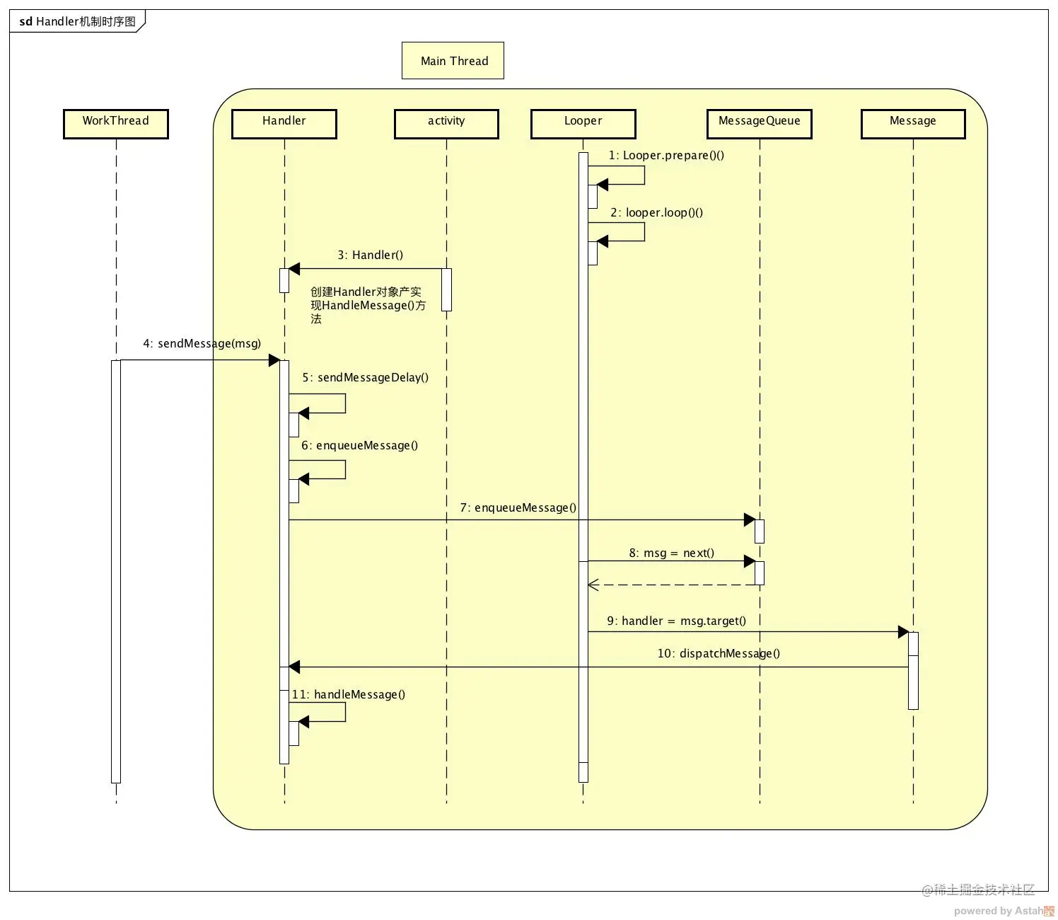 - MessageQueue:单链表数据结构,用于存储和管理Message