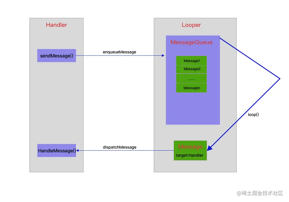 其实Handler总结起来就是,Handler发送Message,Message存到MessageQueue,Looper通过循环取Message,回调Handler的方法,Handler再将消息取出来执行。