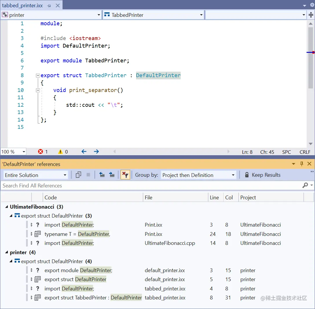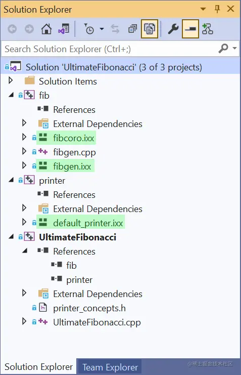 下面是在Solution Explorer中的样子。在这个例子中,fib和printer项目都定义了C++模块。