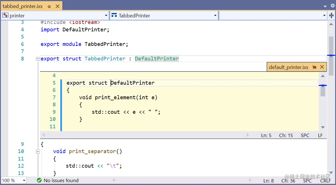 这个例子导入了上面的DefaultPrinter模块,并覆盖了它的print_separator函数。其他代码现在可以导入这个TabbedPrinter,而不需要担心DefaultPrinter的细节。Visual Studio将确保一切都以正确的顺序构建。