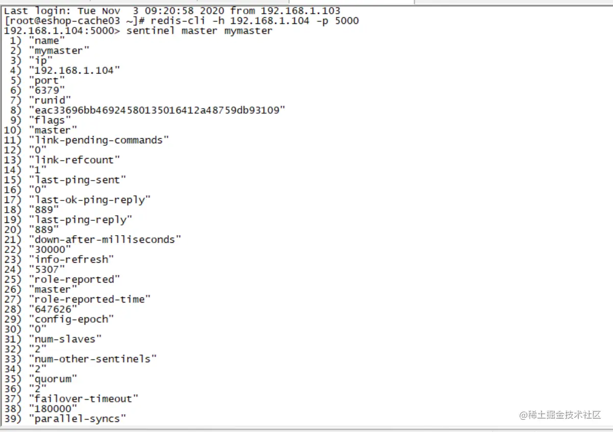 down-after-milliseconds:哨兵与master 超过多少毫秒断开连接,判定master宕机(主观宕机),这里配置的是60000ms。sentinel failover-timeout mymaster 180000failover-timeout:执行故障转移的超时时间sentinel parallel-syncs mymaster 1parallel-syncs:新的master切换过来后,同时有多少个slave去连接新的master,重新做数据的同步,数字越低,花费的时间越多。如果