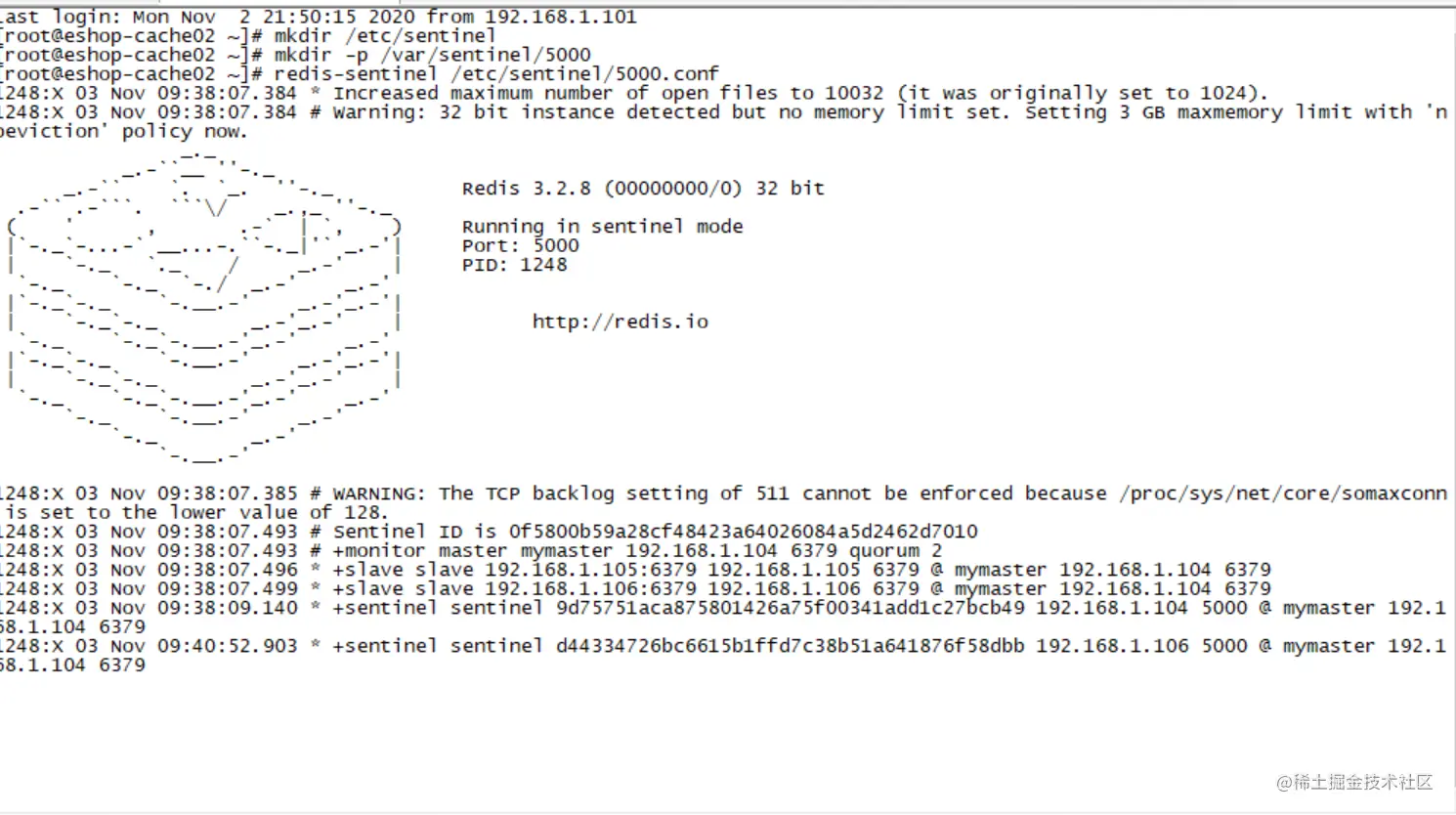 /etc/sentinel目录下面# 部署在192.168.1.104上的哨兵配置 port 5000 bind 192.168.1.104 dir /var/sentinel/5000 sentinel monitor mymaster 192.168.1.104 6379 2 sentinel down-after-milliseconds mymaster 30000 sentinel failover-timeout mymaster 60000 sentinel parallel-syncs mymaster 1 # 部署在192.168.1.105上的哨兵配置 port 5000 bind 192.168.1.105 dir /var/sentinel/5000 sentinel monitor mymaster 192.168.1.104 6379 2 sentinel down-after-milliseconds mymaster 30000 sentinel failover-timeout mymaster 60000 sentinel parallel-syncs mymaster 1 # 部署在192.168.1.106上的哨兵配置 port 5000 bind 192.168.1.106 dir /var/sentinel/5000 sentinel monitor mymaster 192.168.1.104 6379 2 sentinel down-after-milliseconds mymaster 30000 sentinel failover-timeout mymaster 60000 sentinel parallel-syncs mymaster 1唯一需要修改的是bind