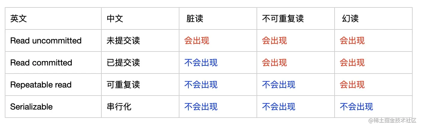 下面具体看下各隔离级别是如何解决或未解决上面这些问题的:
