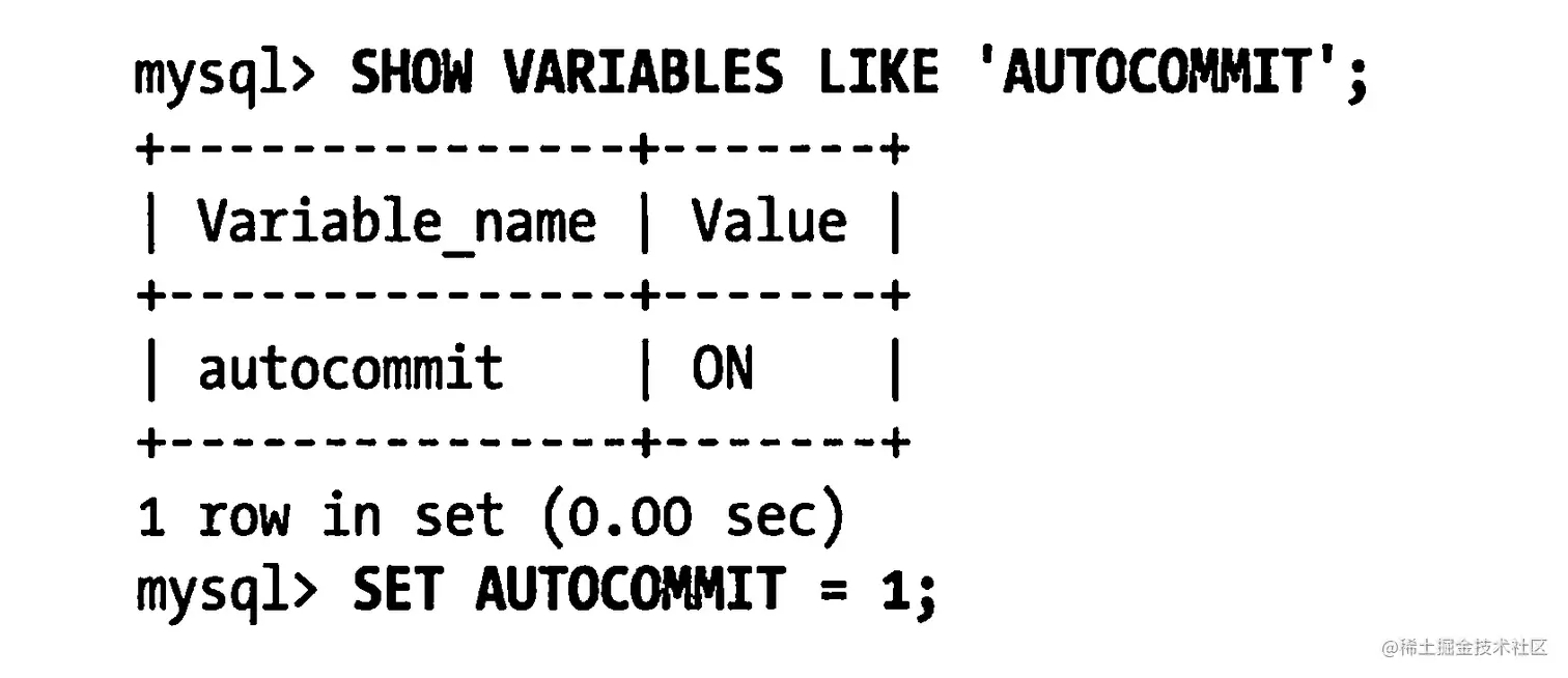 “MySQL默认采用自动提交(AUTOCOMMIT)模式。也就是说,如果不是显式地开始一个事务,则每个查询都被当作一个事务执行提交操作。在当前连接中,可以通过设置AUTOCOMMIT变量来启用或者禁用自动提交模式