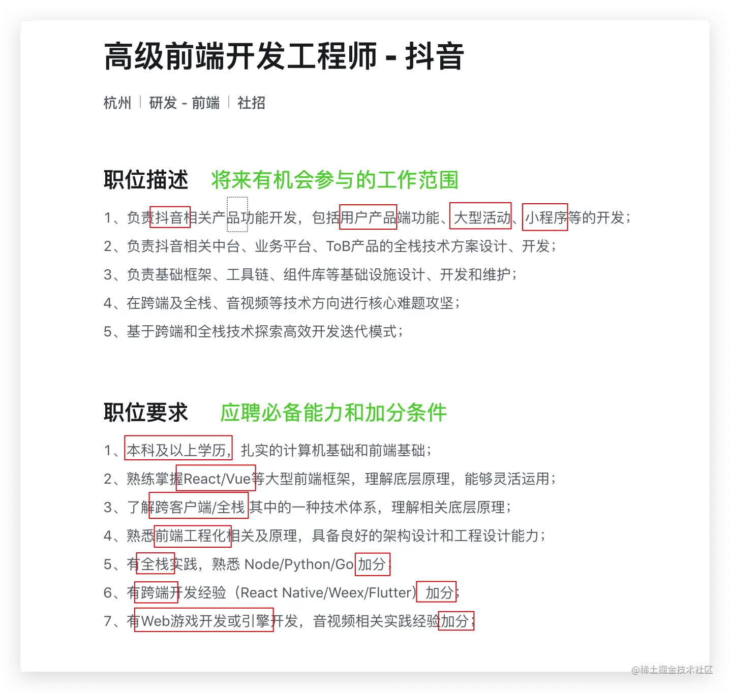 期望岗位。期望岗位要分情况讨论,如果你是直接投递的某个具体岗位,并且可能是内部人员直接定向内推,也可以不写。但我也帮推过一些同学,没有什么岗位要求,就跟你说能不能帮我内推一下你们公司的前端岗位,完了简历发过来也没说具体投递哪一个,甚至你问他他也没有明确的目标。我认为这样自己都不清楚自己想做什么的,HR 也没法给你安排一个很好的岗位。举个例子,在字节里,你搜前端岗位,有初级前端、中级前端、高级前端,有在北京的、上海的,杭州的,有头条业务的、抖音业务、游戏业务的,这么多细分类型,HR怎么帮你投?更何况,HR 每天那么忙,尤其是校招,可能成千上万的简历躺在系统里,根本不会多花一分钟在你这样一份没有质量的简历上的。