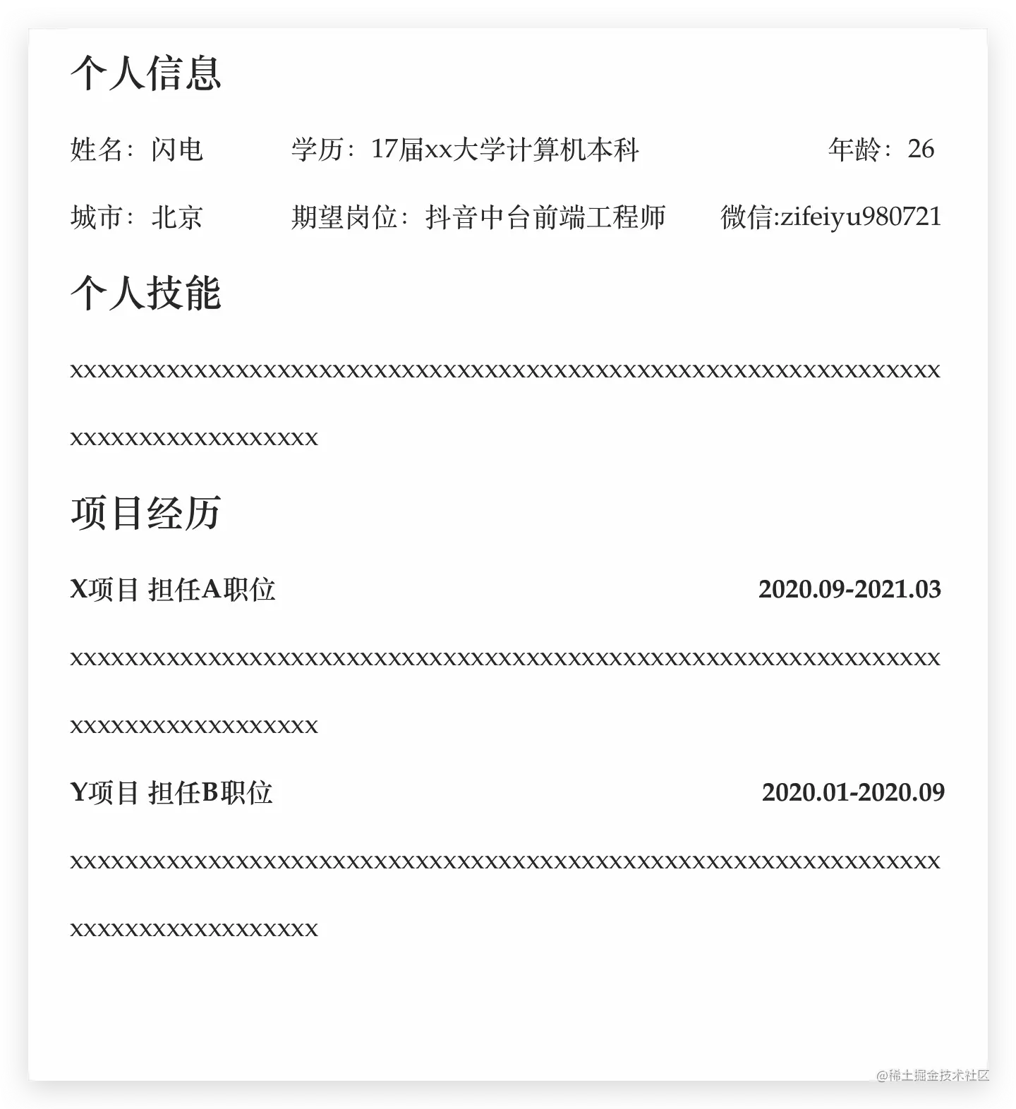 我给出一个简单的范例,你也可以到简历网站,找一个合适的简历模板。比较推荐的简历网站是五百丁。