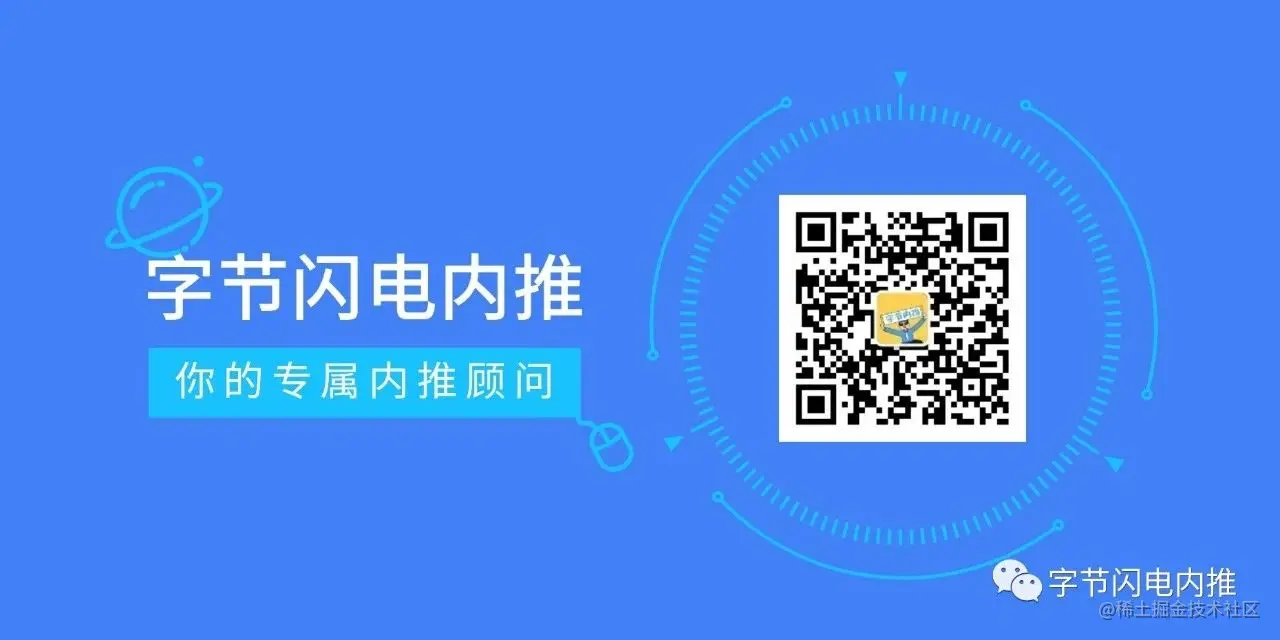 我是闪电🌩,一名字节跳动的研发工程师,如果你有内推需要,欢迎关注“字节闪电内推”公众号,随时找我内推,内推码【RWQMBNH】,也可以点击菜单栏的【内推群】加入微信群聊,和求职的小伙伴们分享经验。工作之余,如果需要帮忙指导简历的,我也非常乐于帮助大家。