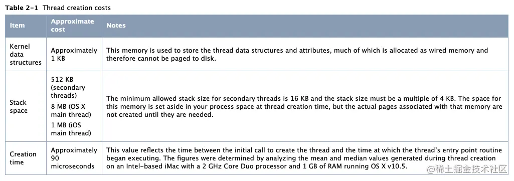 创建时间大概90微秒,这个值反映了从创建线程的初始调用到线程入口点例程开始执行的时间之间的时间。这些数字是通过分析在运行OS X v10.5、配置2 GHz双核处理器和1 GB RAM、基于intel的iMac上创建线程时生成的平均值和中值得出的。
