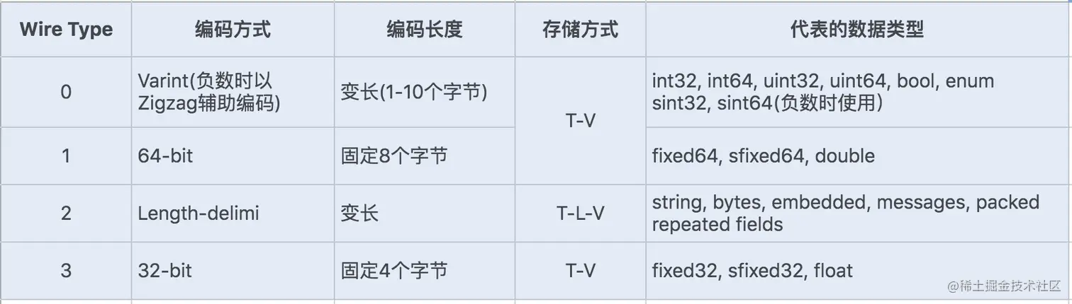 Protobuf 定义了一套自己的编码方式,几乎可以映射 Java/Python 等语言的所有基础数据类型。不同的编码方式对应不同的数据类型,还能采用不同的存储格式。如下图所示: