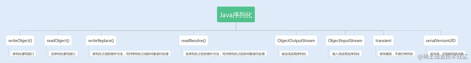 Java序列化类中还定义了两个重写方法:writeReplace()和readResolve(),前者是用来在序列化之前替换序列化对象的,后者是用来在序列化之后对返回对象进行处理的。