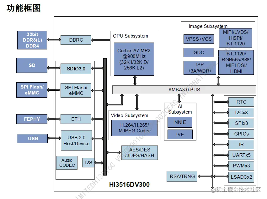 - 一组DDRC,支持32bit/1GB 处理空间,最大数据速率1.8Gbps