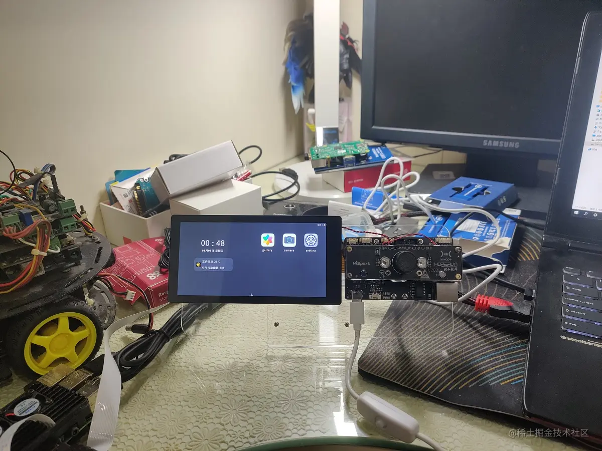 一顿操作之后,就能将其组装在一起。上电可以进入系统,预烧录了一个开源的相册和摄像头应用。