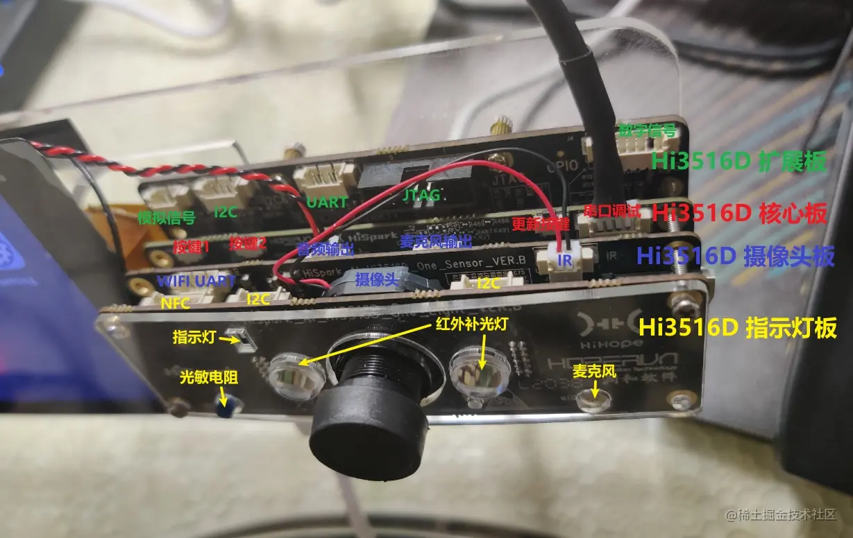 各主板采用堆叠方式插在一起,通过中间的线排来传输电源和信号。更详细的资料可以查看文末的 HiSpark AI Camera 原理图纸。