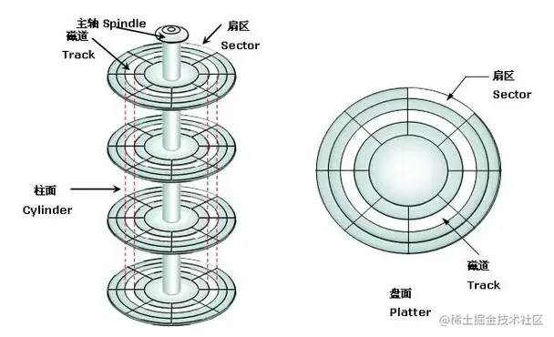 在前文《磁盘开篇:扒开机械硬盘坚硬的外衣!》中,我们了解了机械硬盘的物理构造,是由磁盘面,磁道、扇区等更小的单位组成的,如下图:
