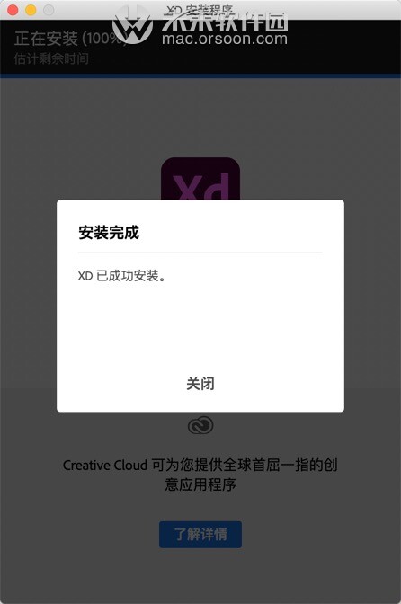 adobe xd mac软件安装完成,点击【关闭】,如图: