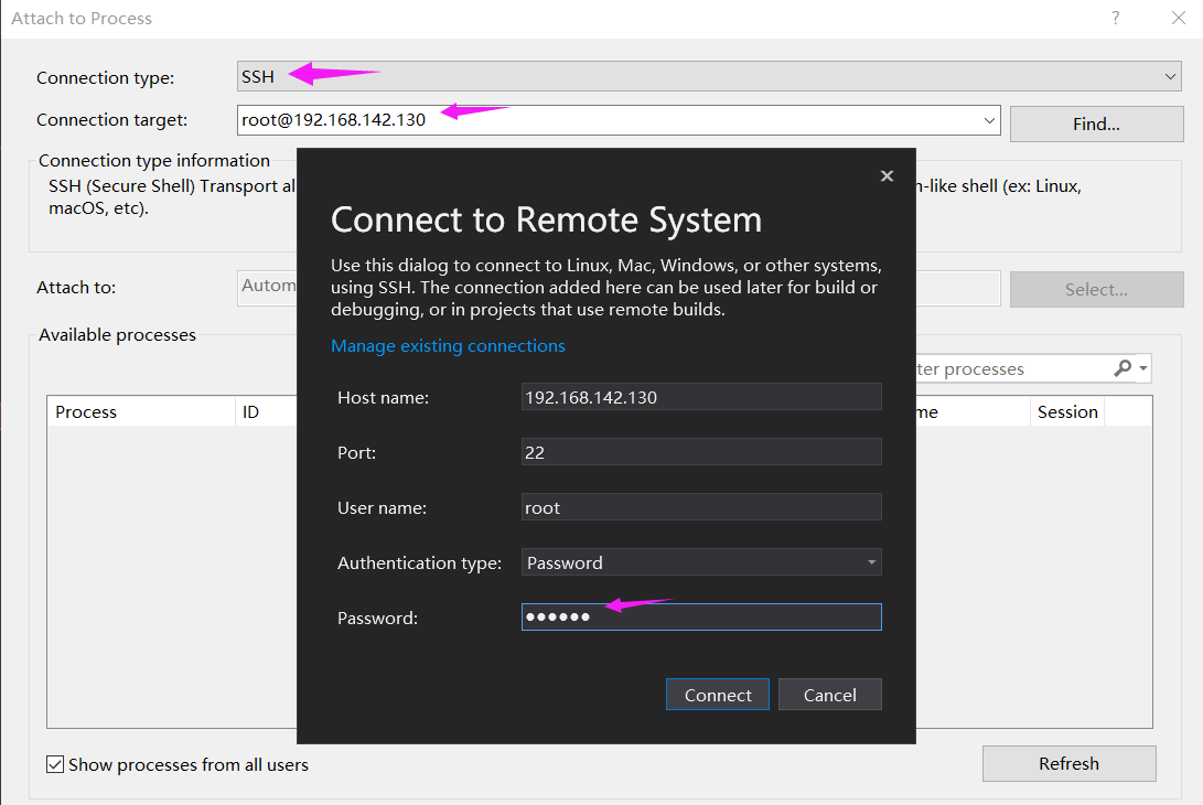在菜单栏依次选择:Debug -> Attach To Process,然后填写 ssh 需要的各种信息,如下图:
