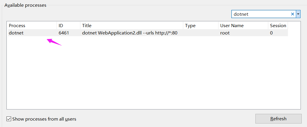点击 Connect 后,就能看到远端机器的 dotnet程序 进程号,选择该进程进行附加,在 Select Code Type 中选择 Nanaged (.NET Core for Unix)即可,如下图: