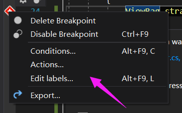 这个就有意思了,在断点上右键是弹出编辑面板,点击左键是关闭断点,问题就出在这里,经常由于手贱,本想点右键结果点了左键 😨😨😨。。。。 好不容易设置好的条件没了。。。真的没了😭😭😭,从此以后,路转黑。如下图:
