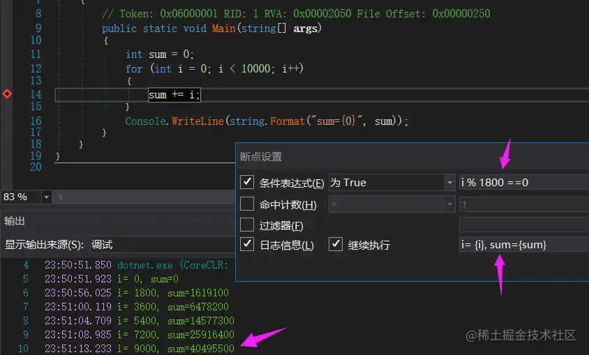 这里就可以用到 Action 断点的日志记录,在 for 循环迭代中,不需要中断断点,只需记录某一个特定状态下当前的 i 和 sum 的值,对调试代码非常有帮助,如下图: