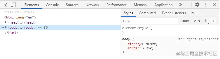 从这里可以看到body里面并没有我们写的属性,这是因为我们打包过后的css代码只是被push到了一个数组中,但是并没有任何地方引用到,我们还需要一个style-loader,将css代码以style标签的形式添加到html代码中。