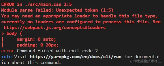 到这里,我们先不使用css-loader来执行打包,在终端输入yarn webpack,会报出一个错误