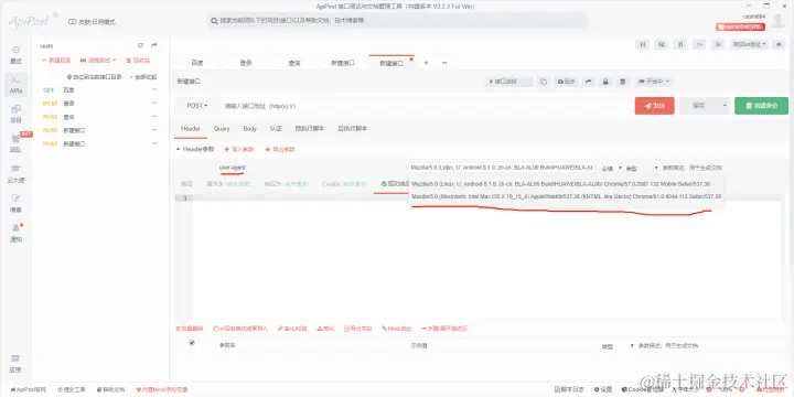 上面说了app和web的header请求是有区别的所以我们在进行app接口测试的时候填写User Agent这个参数。这里的两个选项分别代表苹果和安卓。