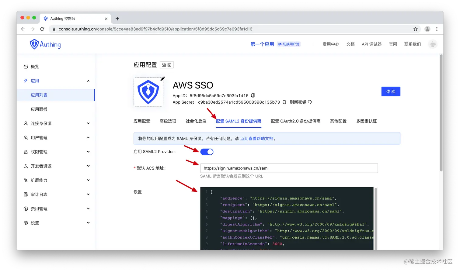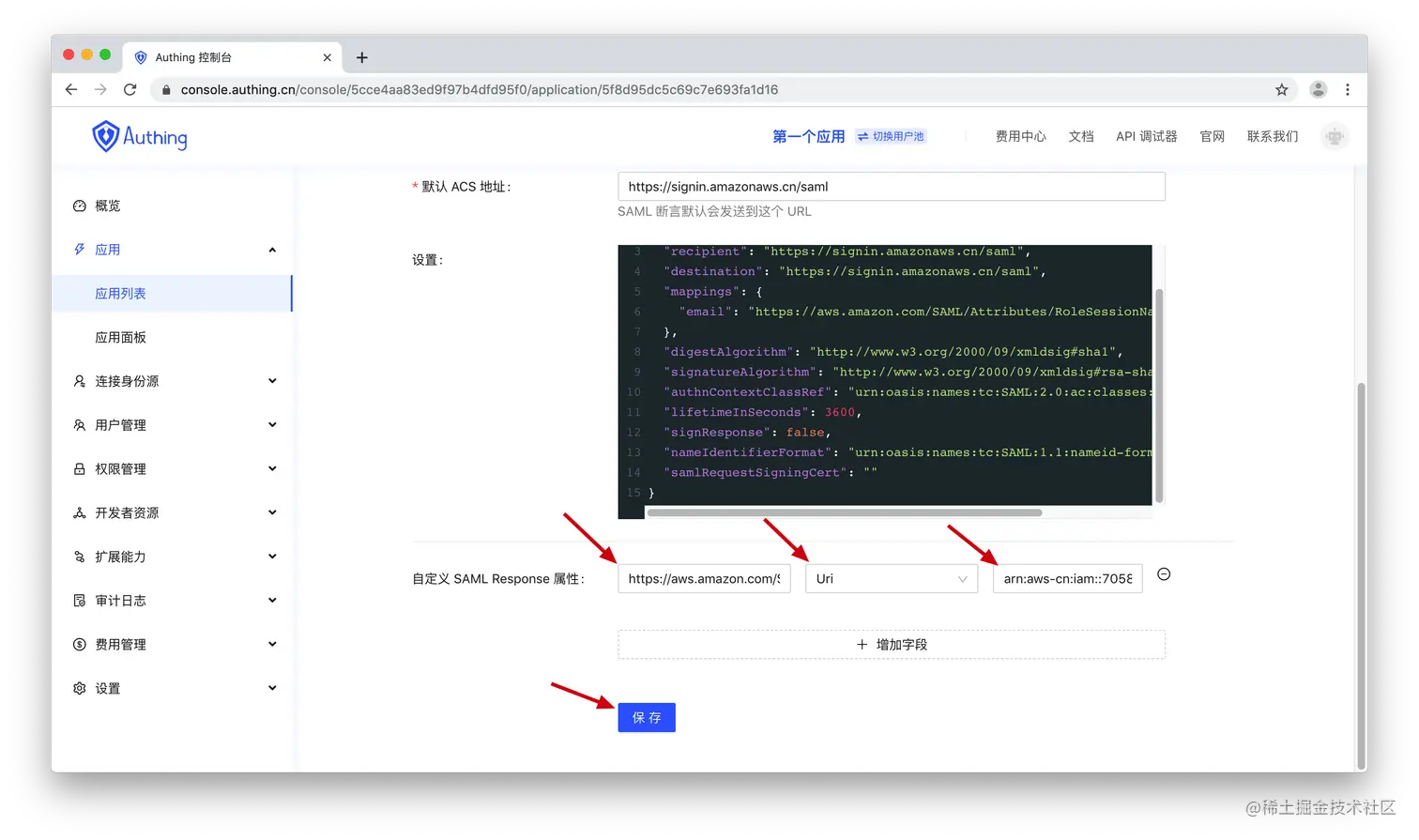 回到 Authing 控制台,在刚才随意填写的地方,将正确的角色 arn 和身份提供商 arn 填写到 Authing SAML2 IdP 的自定义 SAML Response 属性中,点击保存。
