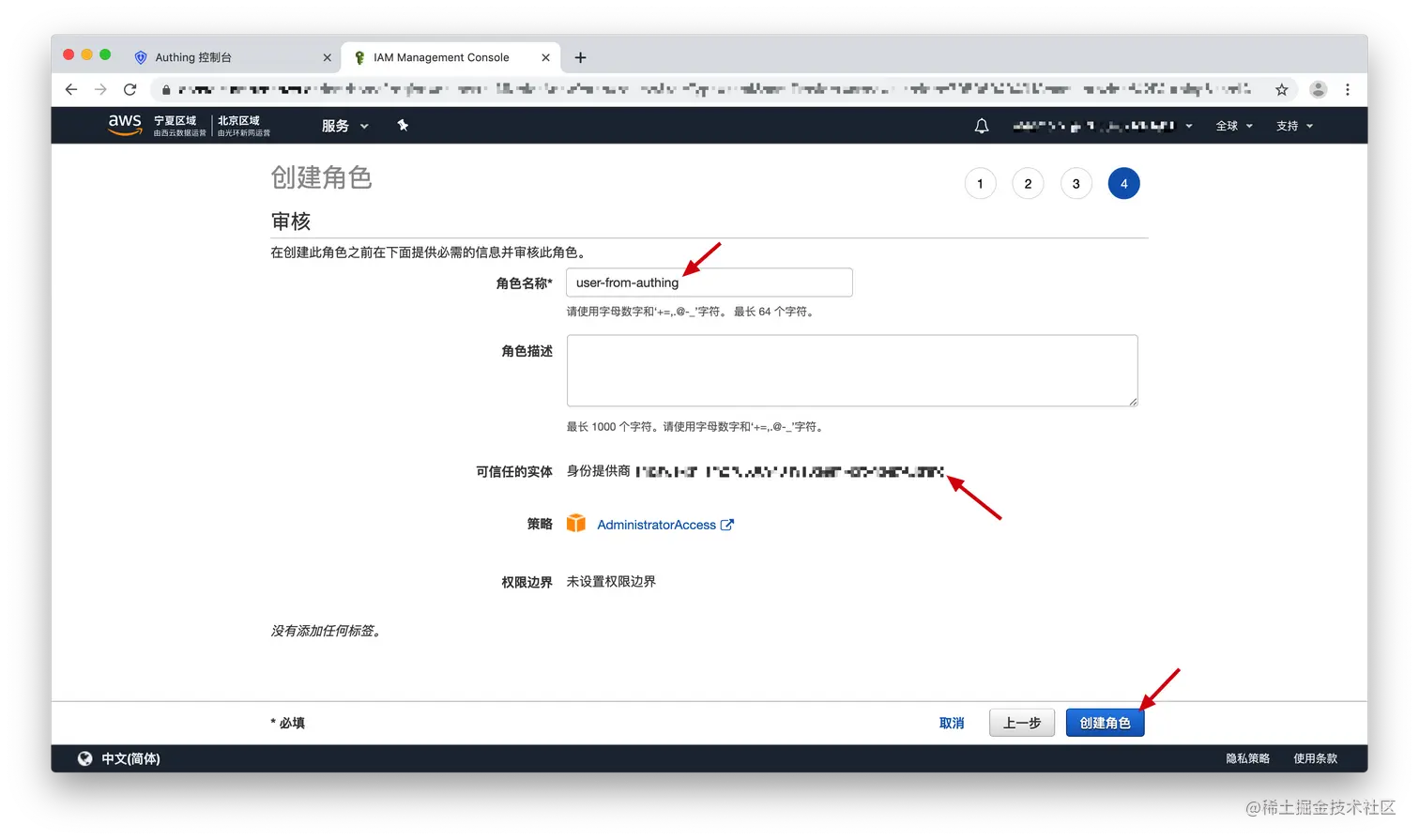 填写一个角色名称,记录下面的身份提供商 arn,然后点击「创建角色」。