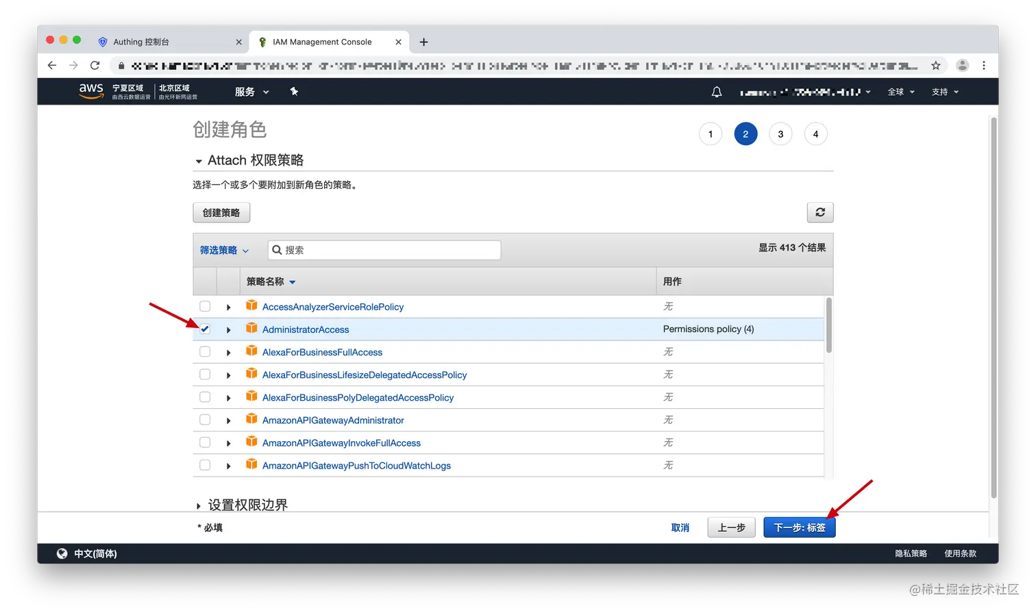 赋予角色权限,本文选择最高权限 AdministratorAccess,然后点击「下一步」。