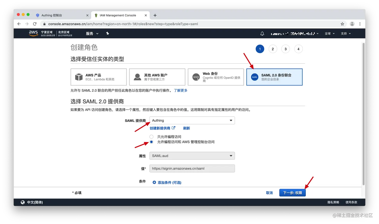 选择 SAML2.0 身份联合,在 SAML 提供商选择刚刚创建的 SAML 提供商,这里选择 Authing,选择允许编程访问和 AWS 管理控制台访问,然后点击「下一步」。