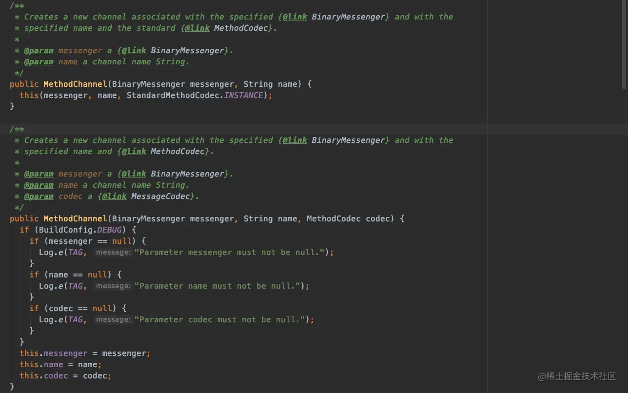 4,创建MethodChannel的实例,提供两种构造方法 messenger和name, message和name 和 MethodCodec