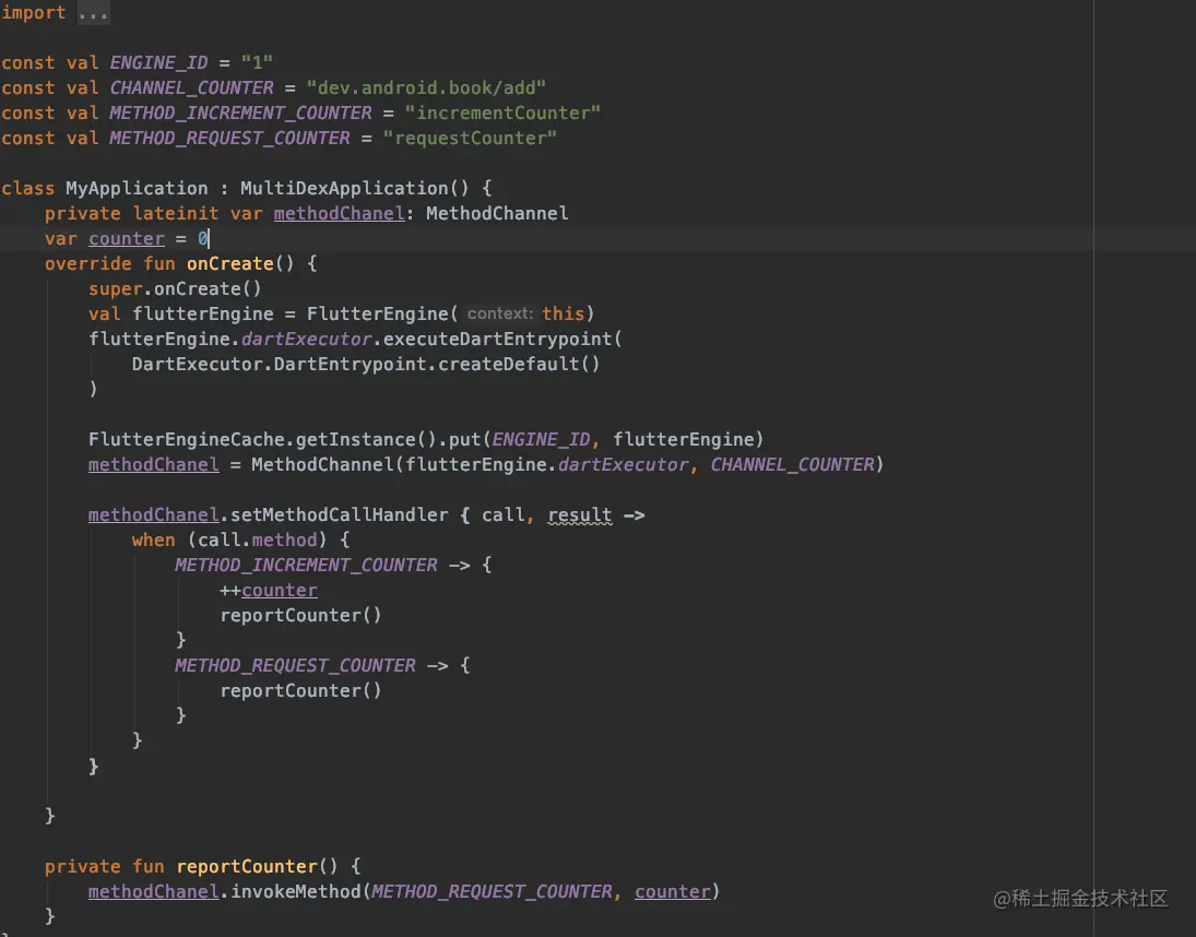 2,在所在的类中直接初始化 MethodChannel ,比如 final _channel = MethodChannel(channel_name); 参数是一个唯一的字符串,这个字符串必须和Android端中的字符串保持一致