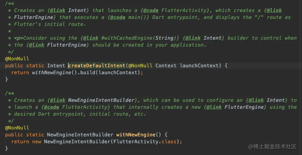 简单解析这三种方式 a和b其实是一样的,FlutterActivity.createDefaultIntent其实调用的还是FlutterActivity.withNewEngine()方法 如下图所示,