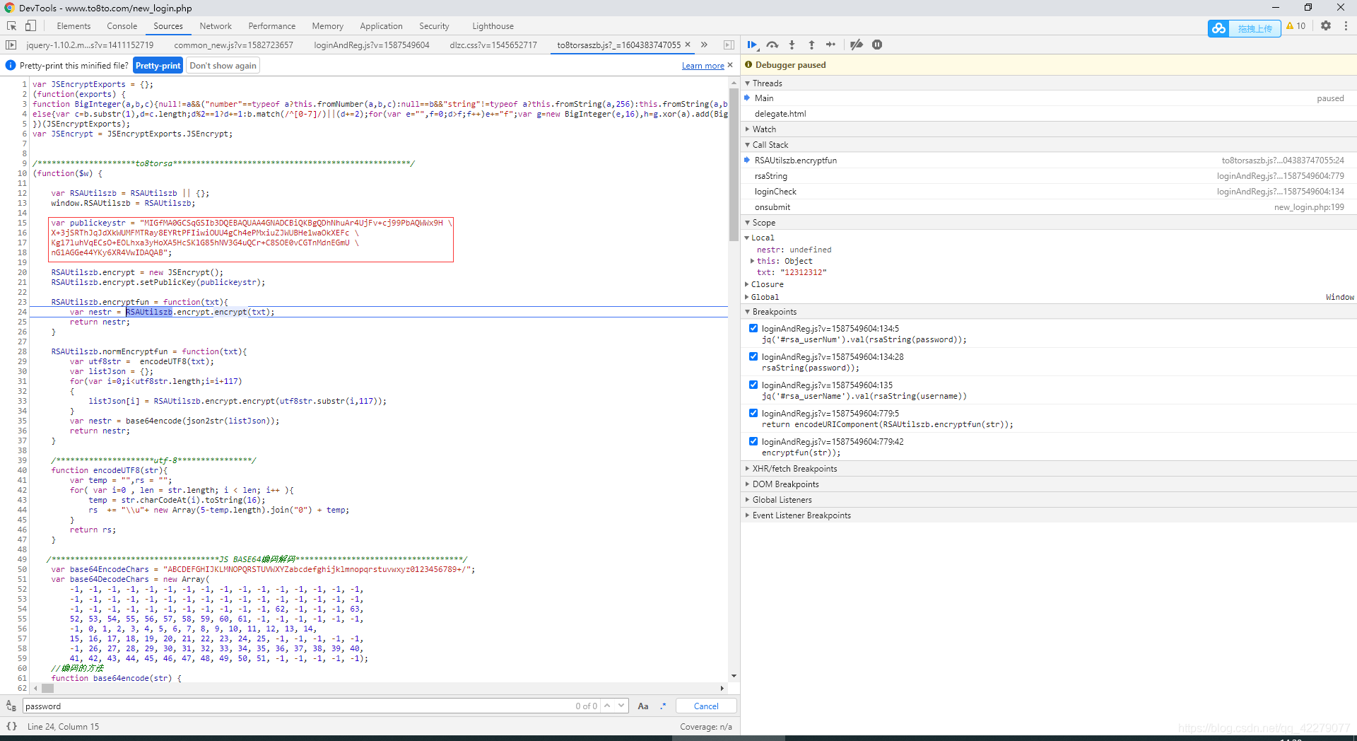 直接下断点,然后在登陆一下看看,我们看见账号密码就在这块进行加密的,那我们跟进去,找到关键的public_key,详细的可以百度RSA算法。
