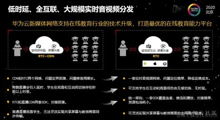 基于华为云的新媒体网络,我们支持在线教育技术升级,打造更优的在线教育平台。在传统架构下,实现低时延互动与大规模分发需要用到2个产品RTC 和CDN,这样存在4个问题: