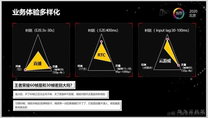 业务体验多样化,就是不同业务对体验的规格要求不同,主要存在三个方面:质量,规模,时延;如直播时延<5s;RTC时延<400ms;云游戏时延<10